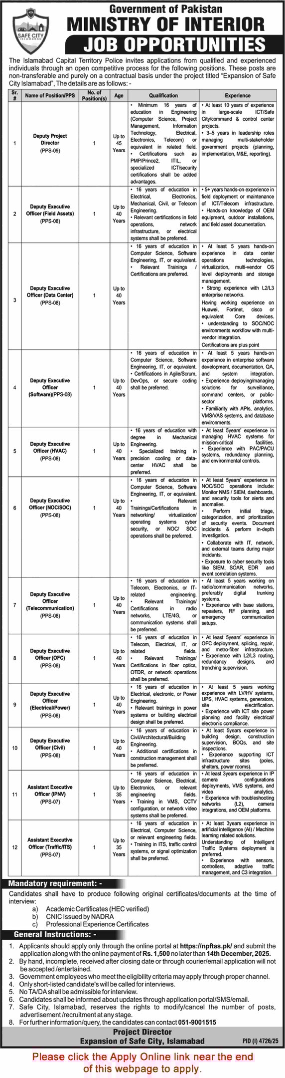 Islamabad Capital Territory Police Jobs December 2025 for Deputy / Assistant Executive Officers
